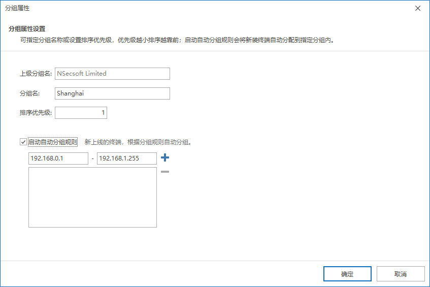 当终端数量较多、分支机构/网段明确时,建议使用按 IP 段自动分组,实现终端上线后自动归类,减少人工维护成本。