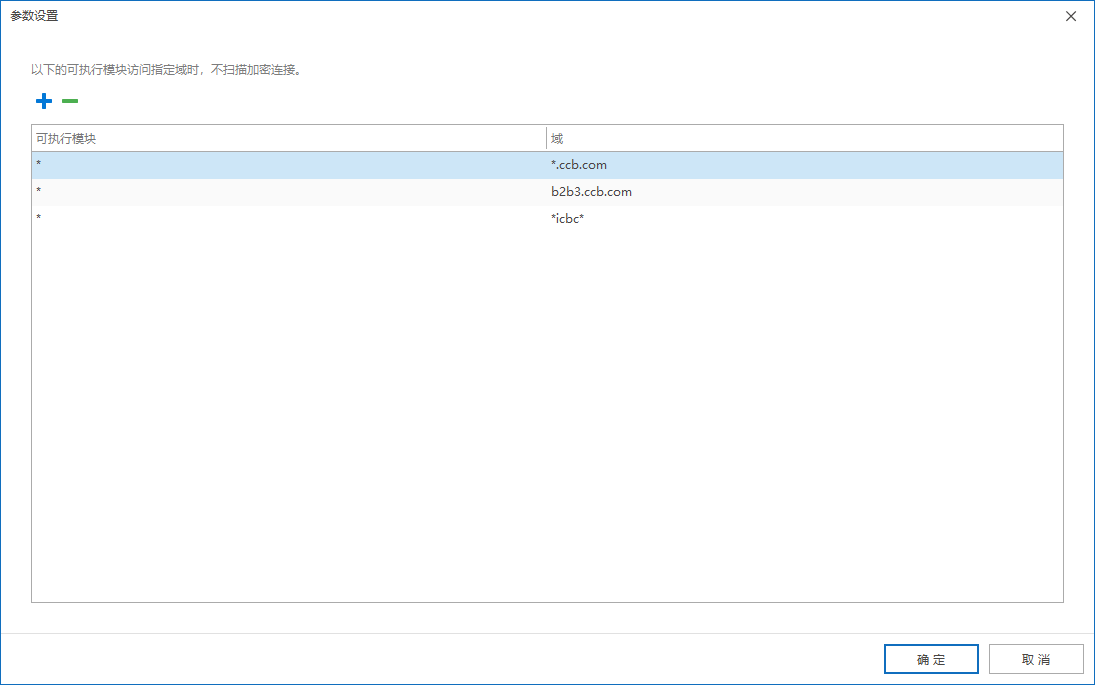 4. 在“可执行模块”中填写 *,在“域”内容中填写相关网银域名信息,域名格式支持通配符,例如:*ccb*、*.ccb.com