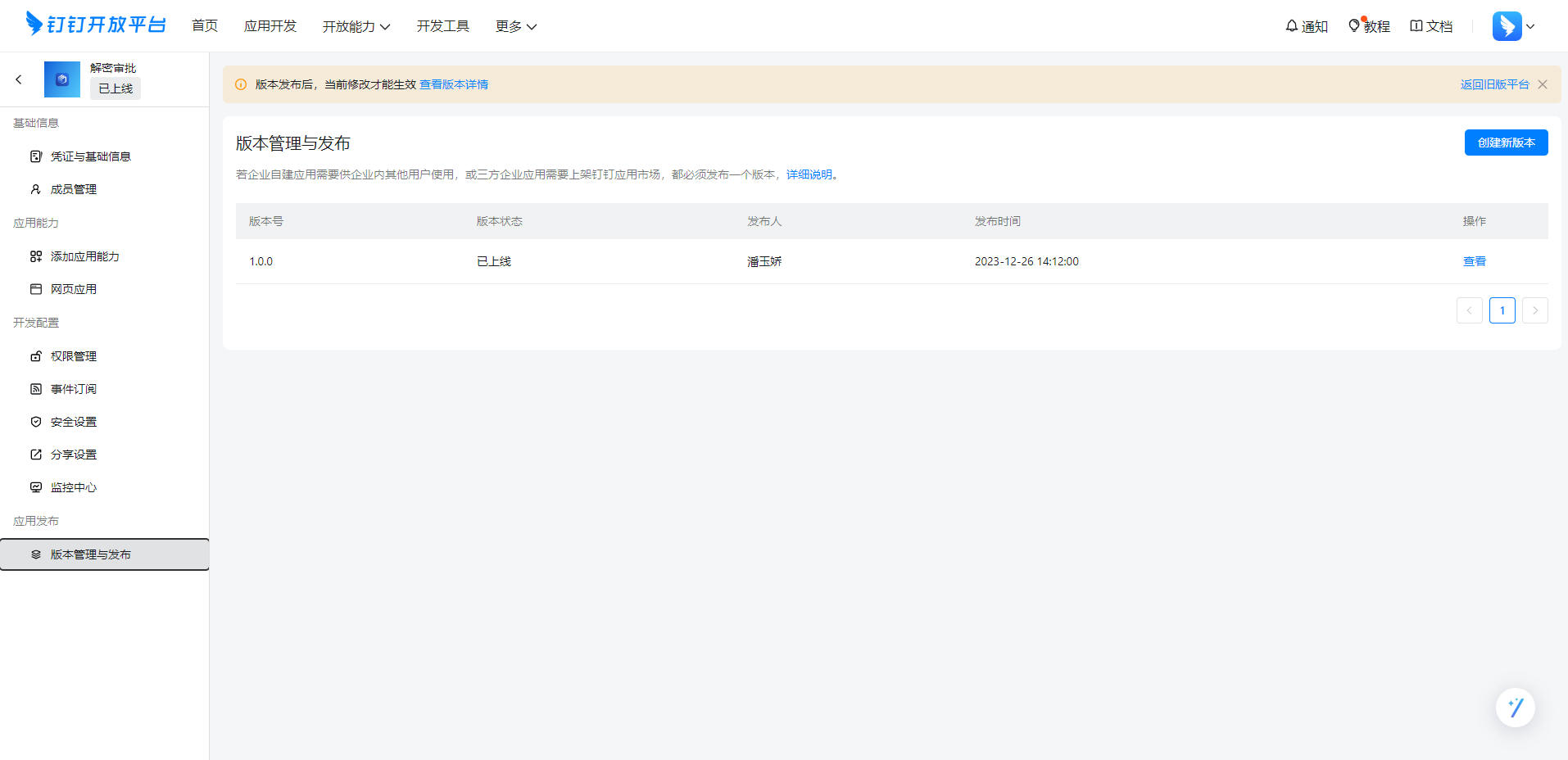 完成以上操作后,最后进行版本发布。点击“版本管理与发布”按钮,点击右上角“创建版本”按钮,填写版本详情,根据自己所需填写应用版本号和版本描述,选择应用可用范围,最后点击“保存”按钮,再点击“直接发布”,发布成功。