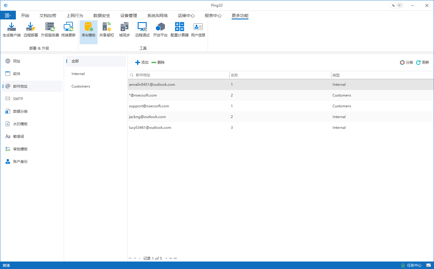 Ping32 提供丰富的库和模版,以满足企业对于数据安全和业务流程审批的不同需求。本篇主要介绍“库和模板”中邮件地址库的设置。邮件地址库为管理员提供了一个方便、高效地管理工具,可以帮助管理员更好地管理和维护终端用户的电子邮件活动。