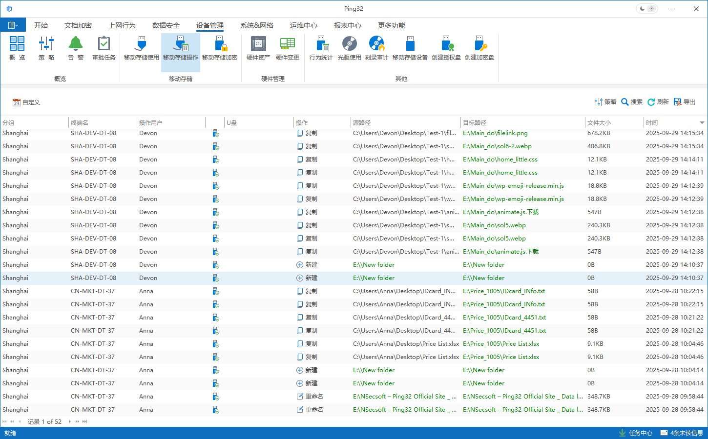 仅知道某台终端“插过 U 盘”,通常还不足以支撑完整审计。在很多场景中,管理员更关心的是员工具体拷贝了哪些文件到 U 盘、又从 U 盘拷回了哪些文件到电脑。通过 Ping32 的 移动存储操作 记录,管理员可以进一步查看文件级别的 U 盘拷贝情况,提升排查精度。