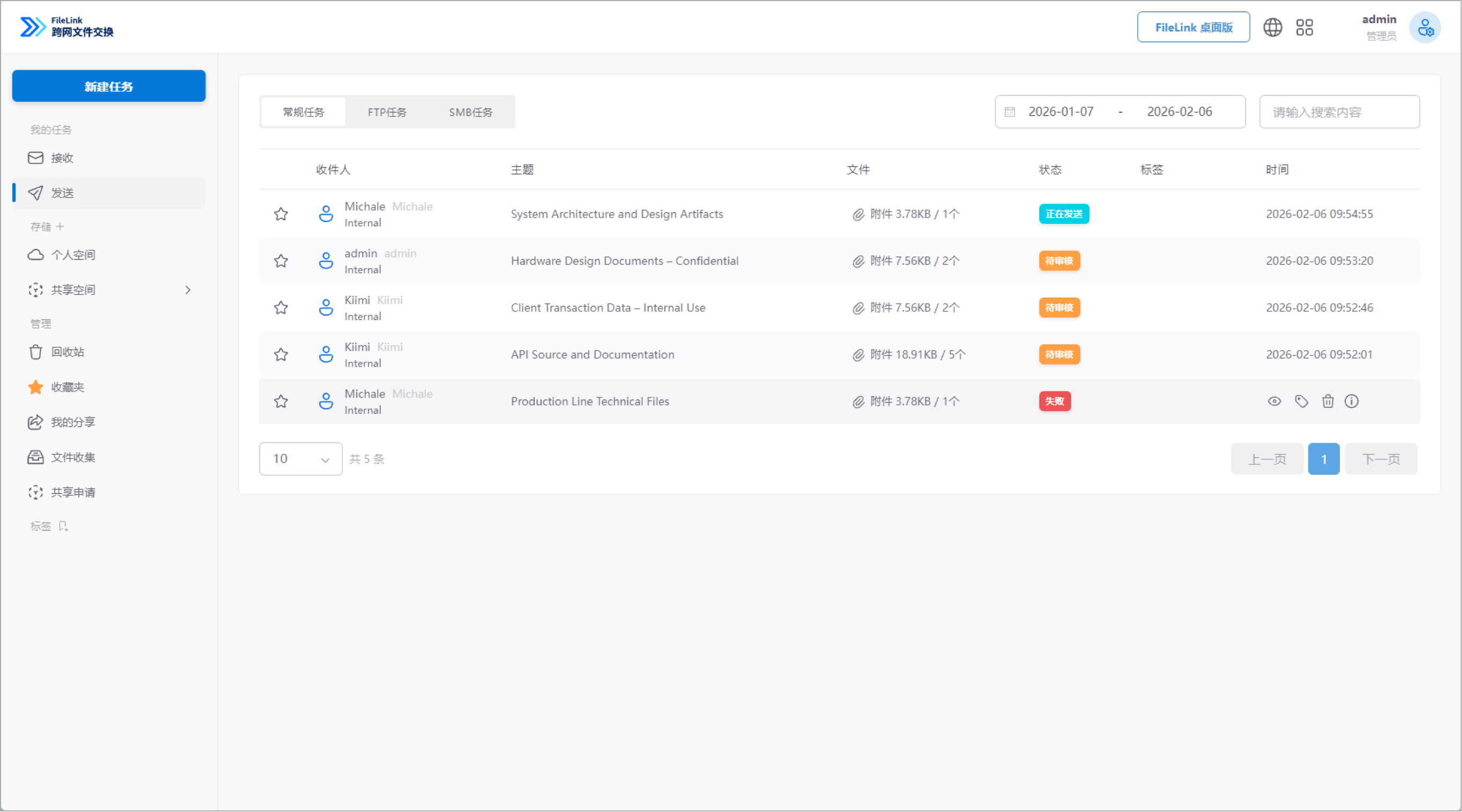 在使用层面,FileLink 为终端用户提供统一的文件交换入口。内网用户可在受控环境中发起文件投递并明确接收对象;外部或其他网络的用户,仅能在被授权的前提下接收或下载文件。整个过程中,每一次操作都会被系统记录并纳入审计范围。