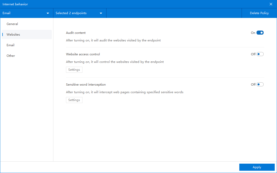 After confirming the policy application endpoint, click Apply to start monitoring and auditing employee web access records.