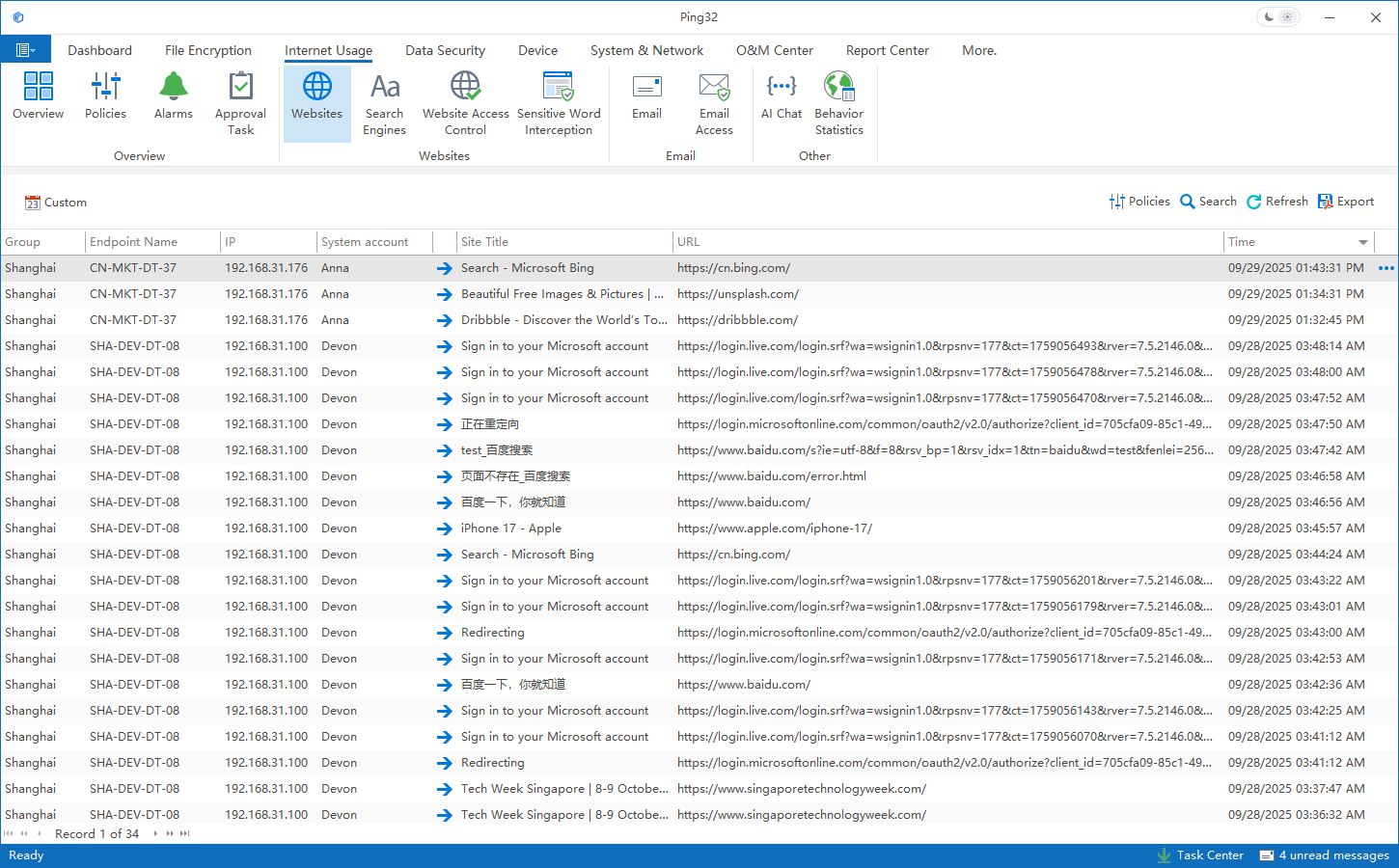 - Return to Internet Behavior → Website Browsing in the Ping32 Management Console to check whether the corresponding record appears.