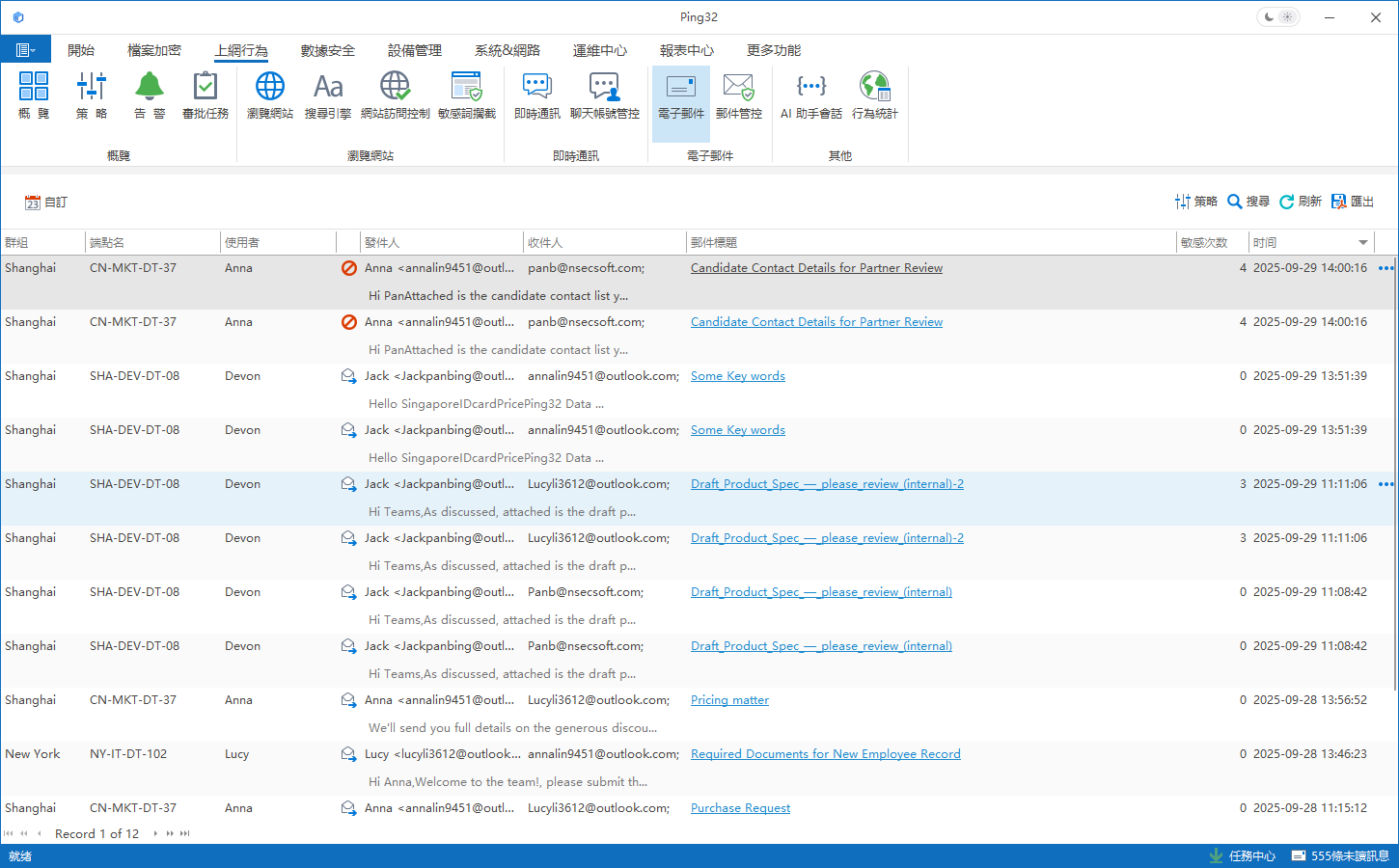透過敏感關鍵字留痕與電子郵件審計識別涉及技術、價格、合作協議等內容的外發風險,並自動形成可追溯記錄;對短時間大量外發、異常頻率或敏感關鍵字集中出現等行為觸發更高級別告警,通知負責人評估與處置。