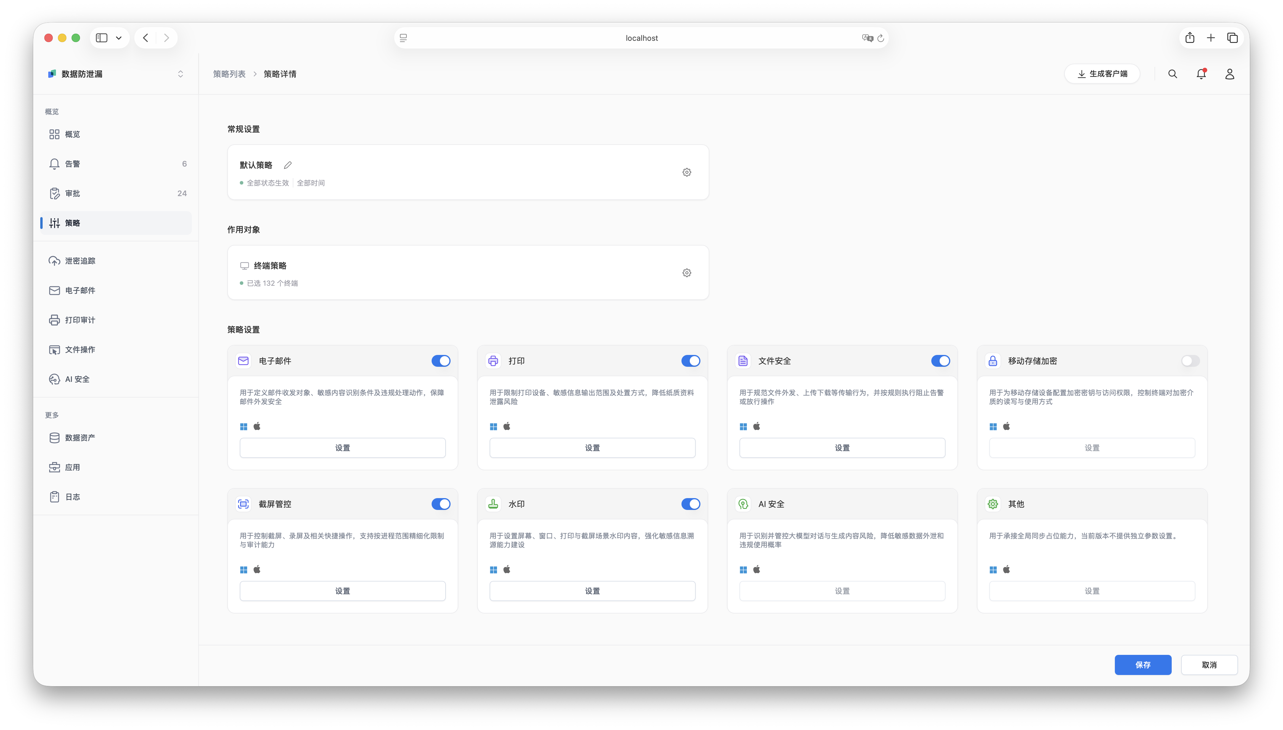 首先,Ping64 延续了我们过去十余年在终端安全与数据安全领域的技术积累,基于一体化平台架构,打破传统安全产品之间的能力孤岛,实现统一能力整合与协同治理。我们将原有核心模块进行深度融合,在统一控制平面下实现策略编排与集中管理,包括: