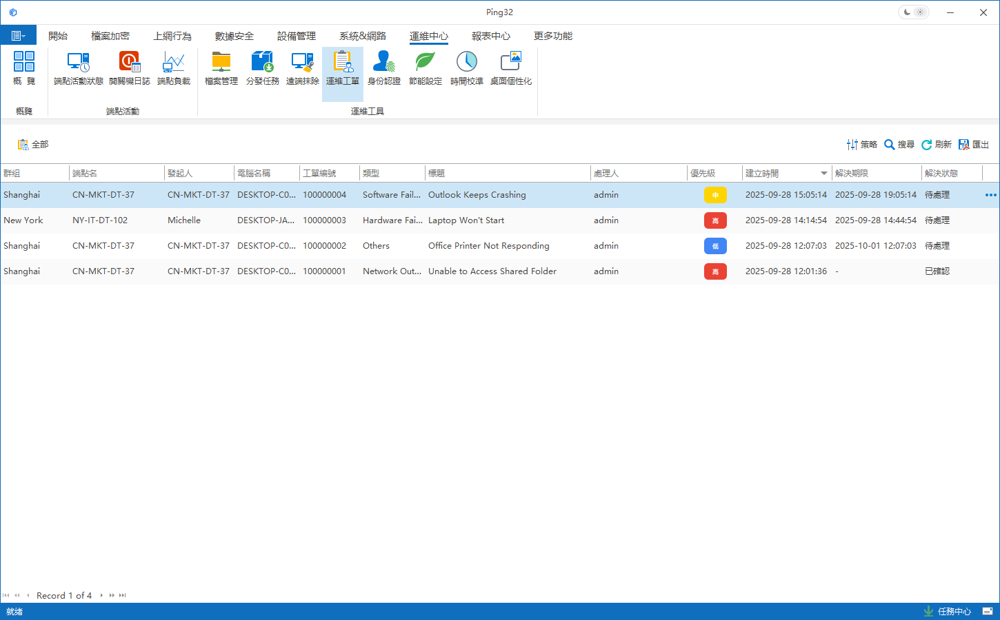 在初始階段,企業可優先統一維運行為入口,要求所有遠端支援與終端處理皆透過 Ping32 維運中心完成。透過工單機制規範問題提交流程,使遠端操作不再依賴個人習慣或臨時方式。此階段重點在於建立基礎可見性,即明確遠端操作的對象、執行人與時間,為後續管理奠定基礎。