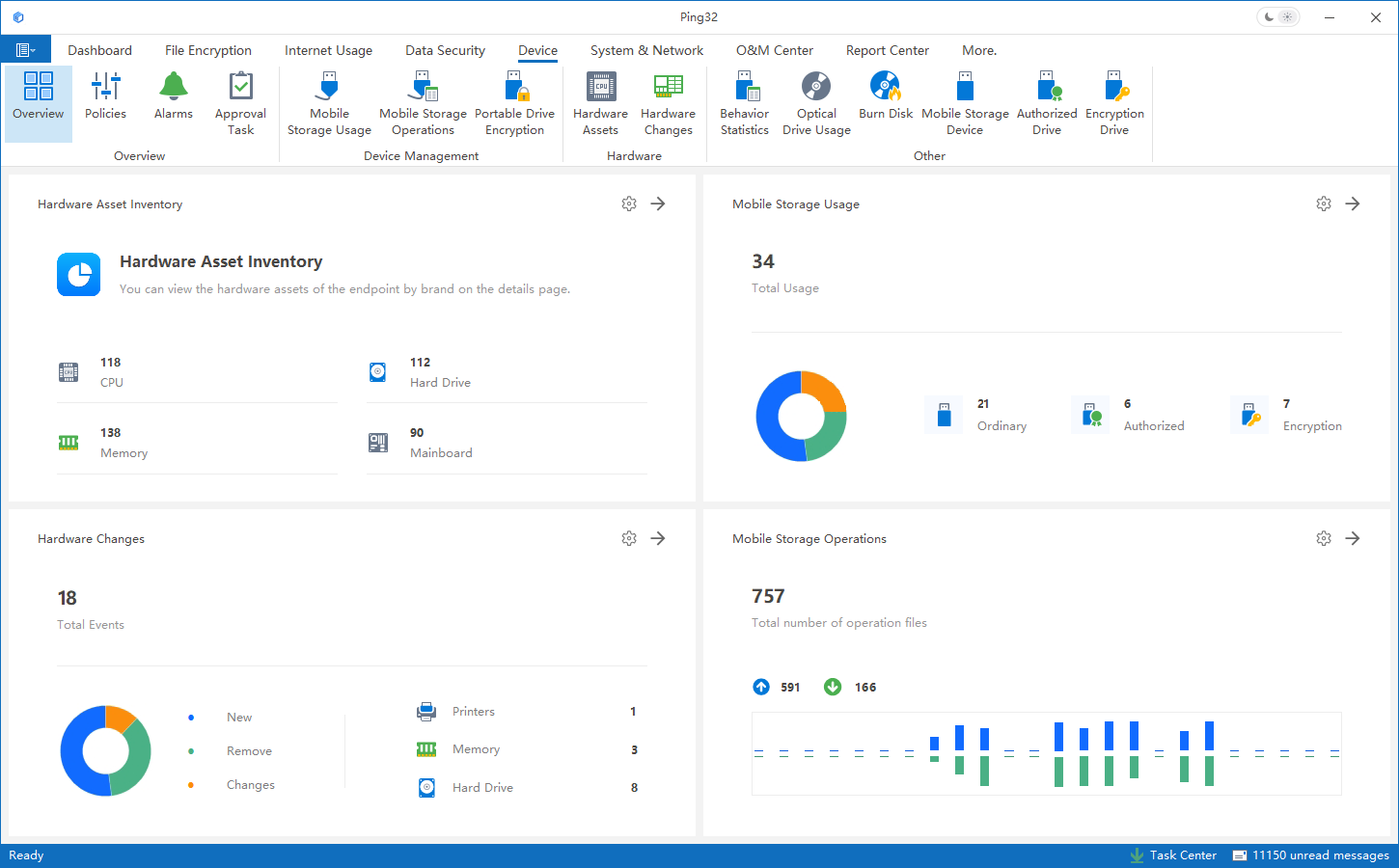 Ở mảng phần cứng, Ping32 tự động thu thập thông tin quan trọng như CPU, RAM, ổ đĩa, bo mạch chủ, card mạng… để tạo sổ tài sản được cập nhật liên tục, giúp nhà quản trị nắm quy mô và phân bổ theo thời gian thực. Đồng thời, hệ thống giám sát liên tục thay đổi cấu hình phần cứng; khi phát sinh tăng/giảm hoặc cấu hình bất thường, hệ thống sẽ kích hoạt cảnh báo nhằm phát hiện sớm thay đổi không được cấp quyền. Kết hợp các chỉ số sức khoẻ như S.M.A.R.T của ổ đĩa, Ping32 có thể nhận diện rủi ro hỏng hóc tiềm ẩn từ sớm, giảm khả năng gián đoạn kinh doanh hoặc mất dữ liệu do lỗi phần cứng. Đối với USB và thiết bị ngoại vi, Ping32 cũng có thể đưa vào phạm vi hiển thị và kiểm toán, giảm “điểm mù thiết bị ngoại vi”.